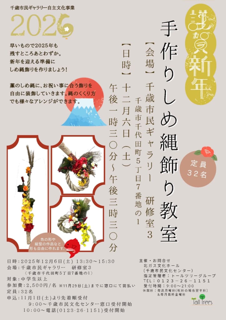 手作りクリスマスリース&しめ縄飾り教室 満席御礼 【日程】 クリスマスリース:2025年11月15日13:30~15:30 しめ縄飾り:2025年12月6日(土)13:30~15:30 【会場】 千歳市民ギャラリー さらに詳しく
